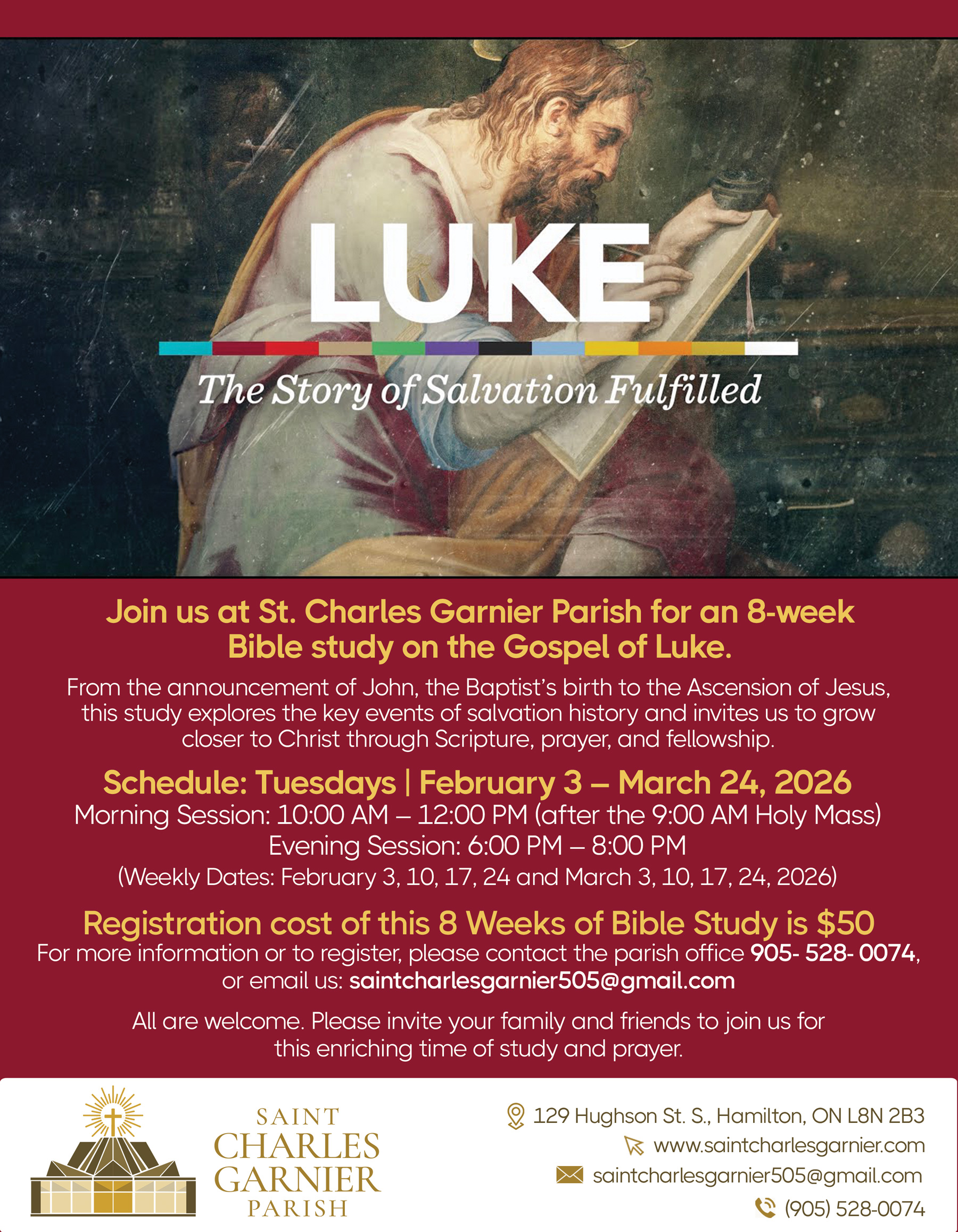 Schedule: Tuesdays | February 3 – March 24, 2026 Morning Session: 10:00 AM – 12:00 PM (after the 9:00 AM Holy Mass) Evening Session: 6:00 PM – 8:00 PM. Registration cost is $50 View Flyer
